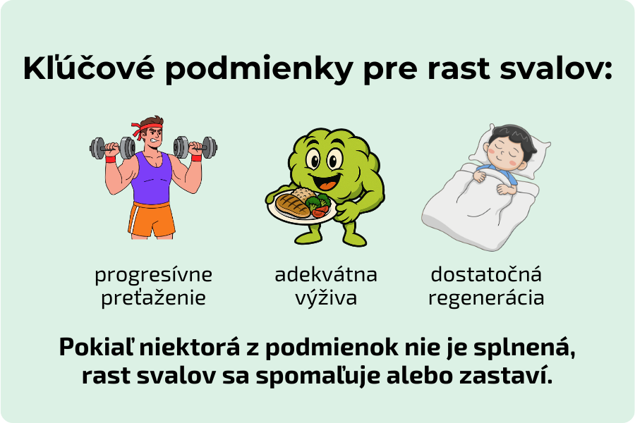 Rast svalov neprebieha počas tréningu, ale počas regenerácie. Častou chybou je snaha cvičiť každý deň, čo vedie skôr k preťaženiu a stagnácii než k nárastu svalovej hmoty.
