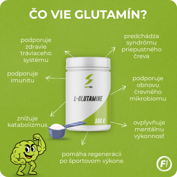 Náš tip: SmartFuel L-Glutamine 500 g100% prírodne fermentovaný L-Glutamín v čistej farmaceutickej kvalite – bez príchuti, plnidiel a cukru. Má neutrálnu chuť a výbornú rozpustnosť a spĺňa certifikáciu GMP. Jedna denná dávka doplní glutamín vo svaloch i plazme a podporí regeneráciu, imunitu a zdravú funkciu tráviaceho traktu najmä v obdobiach vysokej záťaže.