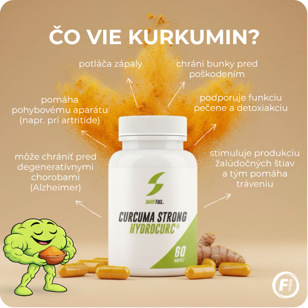 Náš tip: Smartfuel Curcuma HydroCurc®Patentovaná forma najviac biologicky dostupného kurkumínu na svete. Každá kapsula obsahuje 500 mg HydroCurc® - vysoko koncentrovaného extraktu z kurkumy (Curcuma longa). Samozrejmosťou je extrakt čierneho korenia pre ešte lepšie vstrebávanie. Pomáha s trávením, zápalovými procesmi, imunitou aj rovnováhou v tele.