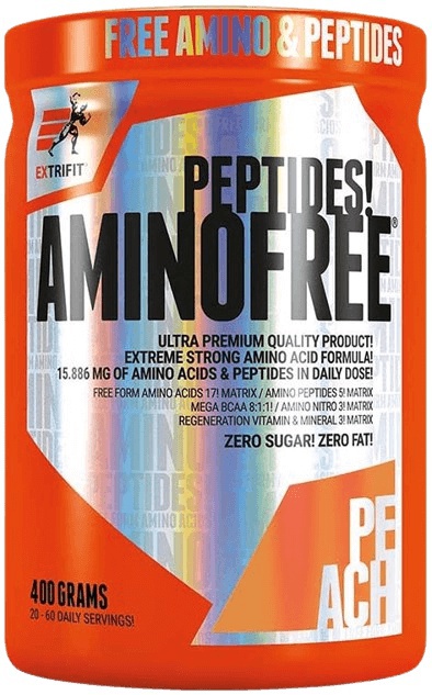 Plné spektrum výhradně volných aminokyselin s vysokou dávkou peptidů je velmi důležité pro růst a regeneraci svalů při intenzivním tréninku. Pozor, svaly se neskládají jen z BCAA, tedy suplementace pouze BCAA je chybou. Je nutné do svalů doplňovat všechny aminokyseliny! AminoFree® Peptides je produkt obsahující extrémně silnou dávku volných aminokyselin (free form) s patentovanými peptidy PepForm®. V jediné odměrce dodáte svému tělu 5296 mg free form aminokyselin a peptidů. V denní dávce (3 odměrky) plných 15 886 mg! Tato účinná směs je obohacena o synergicky působící vitamín B6 (pyridoxin) ve vysoce funkční vysoké denní dávce 250 % RHP a nejdůležitější regenerační minerály draslík a hořčík v optimalizované denní dávce 15 % RHP.