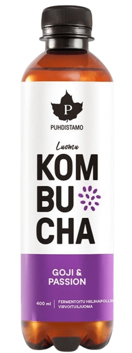 Zloženie - príchuť goji a marakuja: prírodná minerálna voda, organický trstinový cukor, organická kombuchová kultúra, oxid uhličitý, organický koncentrát citrónovej šťavy, prírodná príchuť marakuja, organický zelený čaj, prírodná príchuť goji (žinčica).